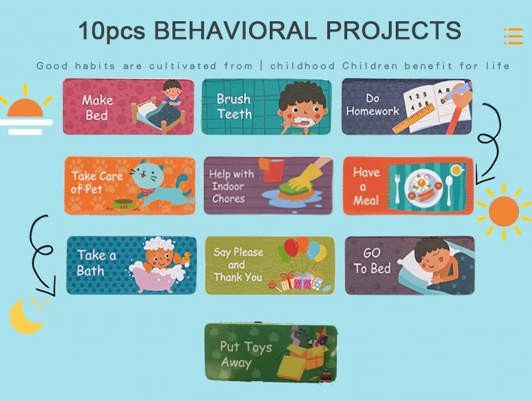10 cartonașe ilustrate cu sarcini zilnice (ex: spălat pe dinți, făcut patul, teme, baie, strâns jucării etc.)