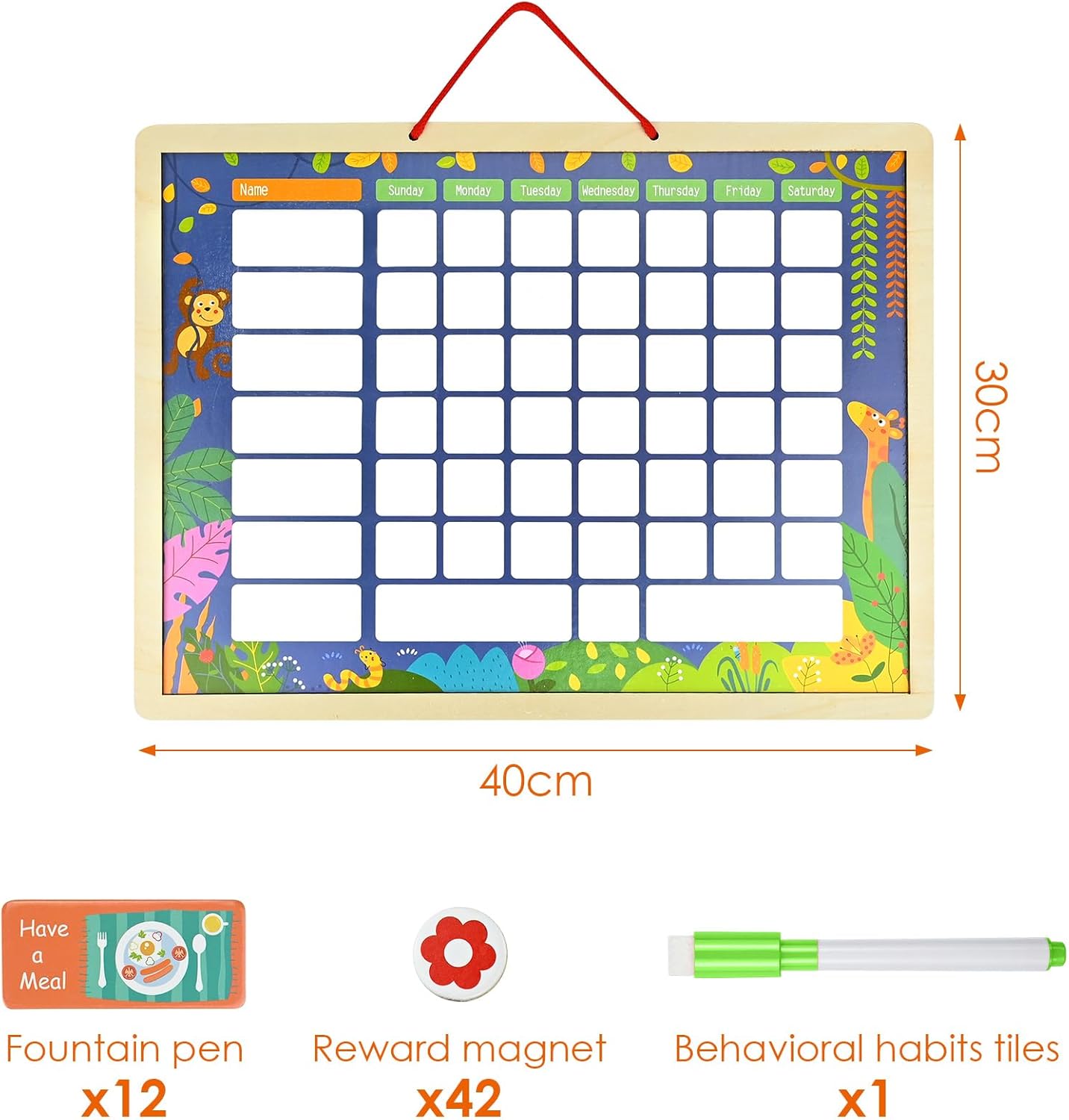 Acest panou magnetic este un instrument educativ și distractiv care îi ajută pe cei mici să își formeze obiceiuri sănătoase și să își dezvolte simțul responsabilității. Cu ajutorul cartonașelor ilustrate și al magneților colorați, copiii pot bifa activitățile realizate zilnic, transformând rutina într-o experiență de joc și motivație.