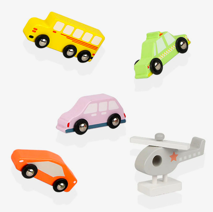 - Accesorii incluse: 4 mașinuțe din lemn și un elicopter, toate pictate cu vopsea ecologică pe bază de apă, sigure pentru copii.