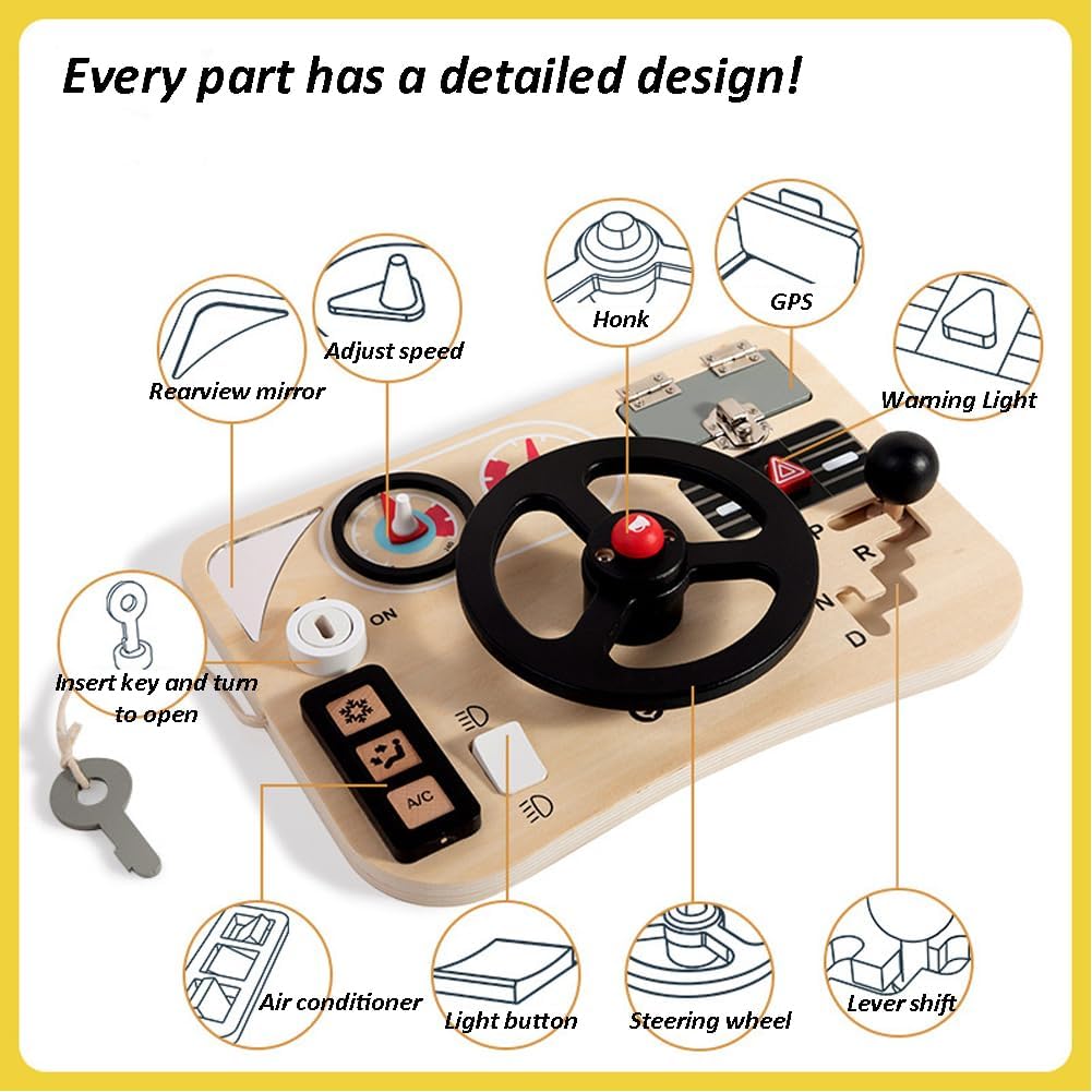 Această jucărie educativă multifuncțională este o alegere excelentă pentru copiii pasionați de mașini și mișcare! Concepută sub forma unui bord auto realist, placa stimulează imaginația, dezvoltă motricitatea fină și încurajează jocul de rol într-un mod sigur și creativ.