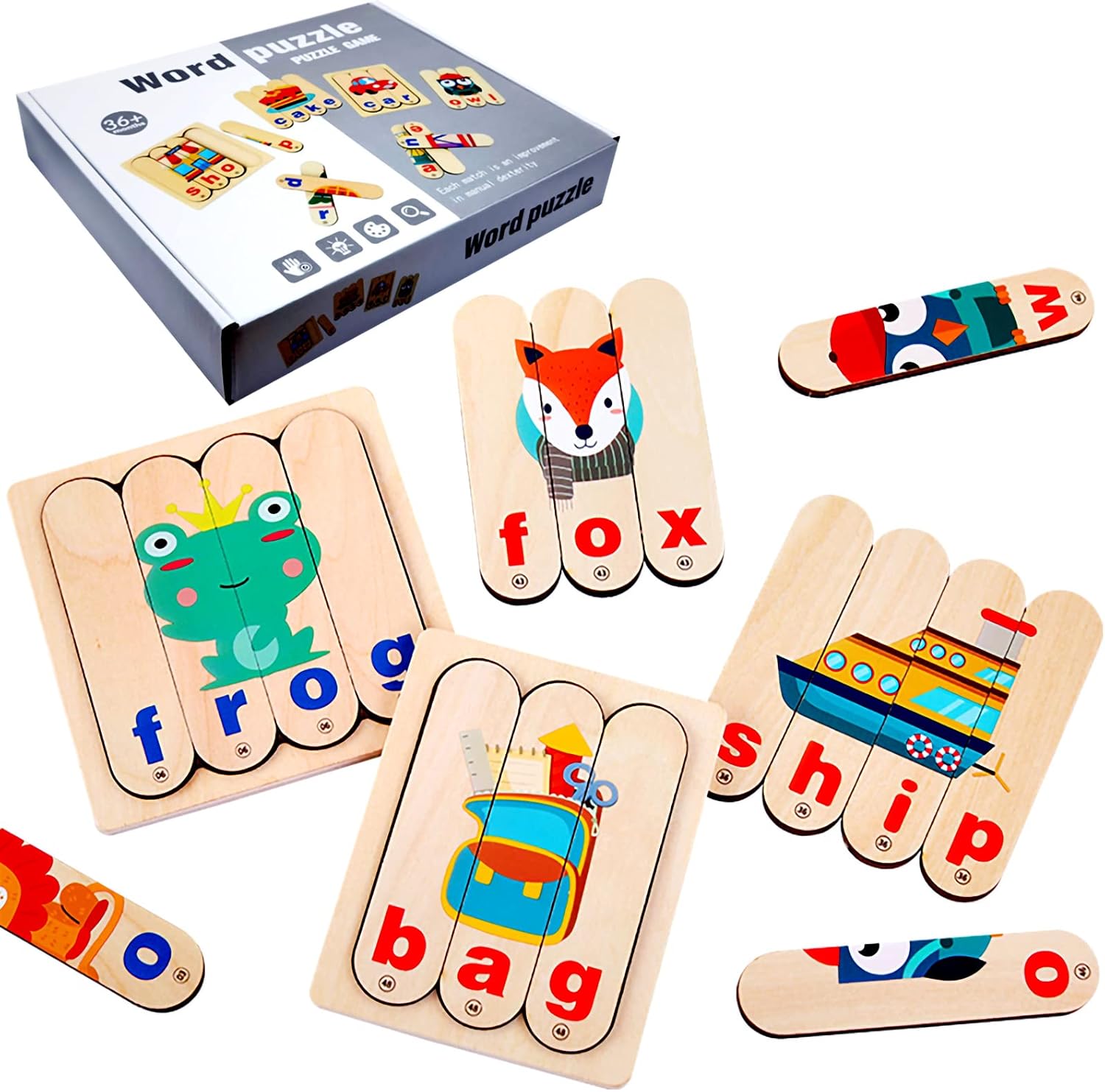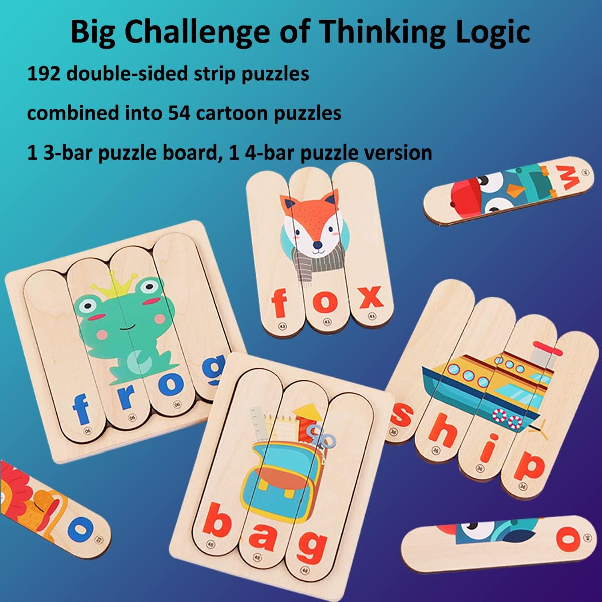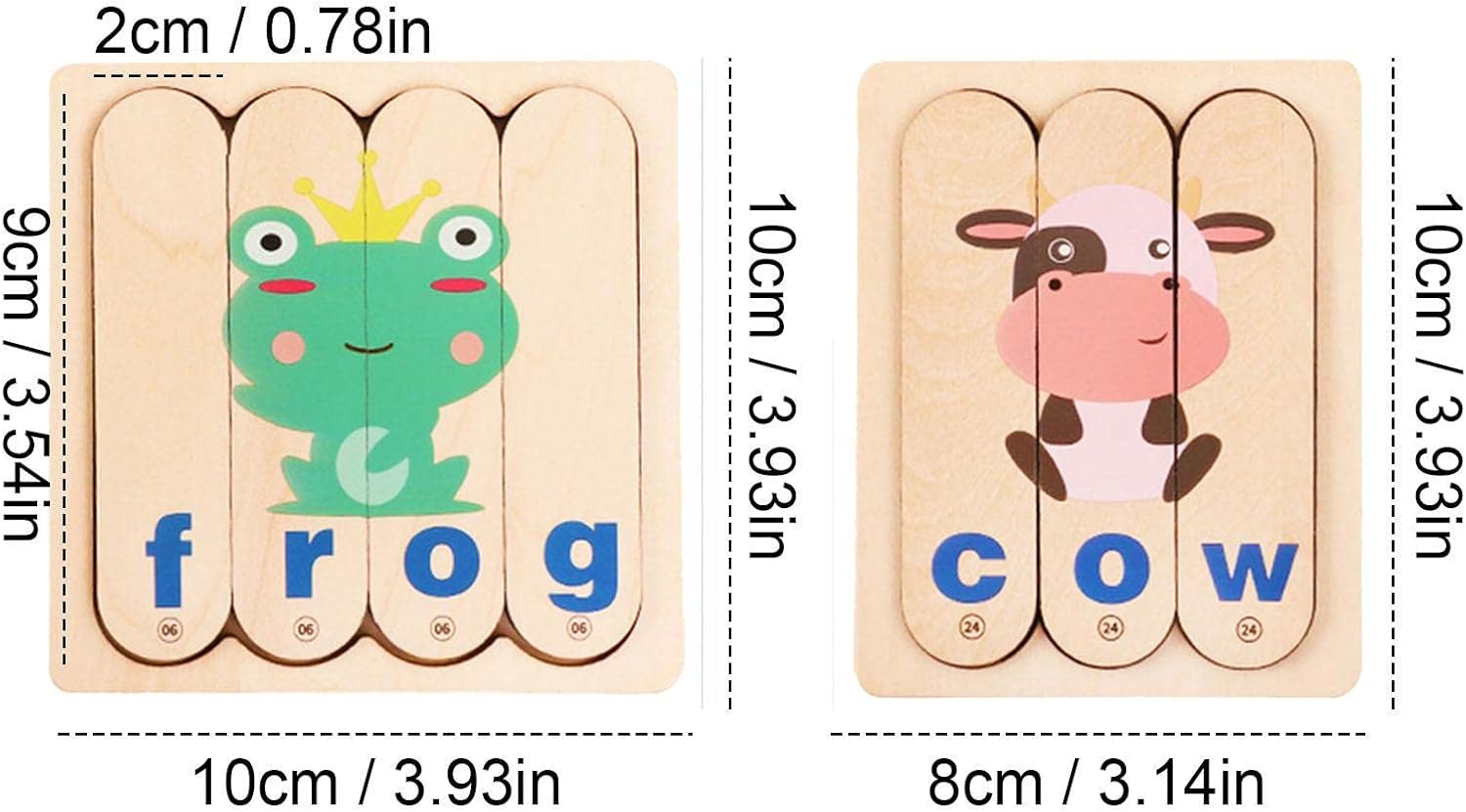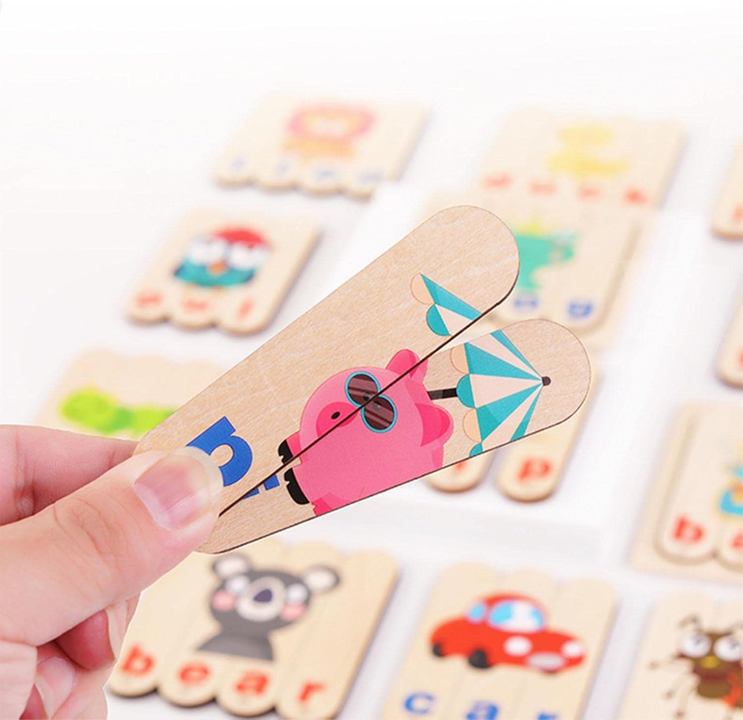 Copilul alege un cuvânt ilustrat (ex: „frog”, „cow”, „car”) și potrivește benzile din lemn pentru a completa desenul și literele corespunzătoare. Jocul poate fi folosit individual, pentru învățare independentă, sau împreună cu părinții și educatorii, ca activitate didactică.