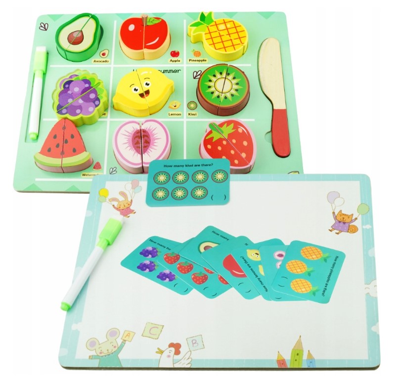 Copilul poate tăia fructele în două părți egale folosind cuțitul din lemn, apoi le poate reasambla datorită magneților. Pe tăbliță poate desena sau scrie, consolidând prin joc abilitățile de scris și desen.