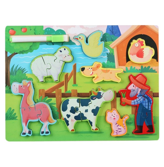 Acest puzzle educativ 2 în 1 îmbină jocul clasic cu piese groase din lemn cu activitatea creativă de desen. Conceput special pentru copiii mici, jocul le permite să descopere animalele de la fermă prin asamblarea puzzle-urilor simple și să își exprime imaginația pe tăblița albă reutilizabilă.