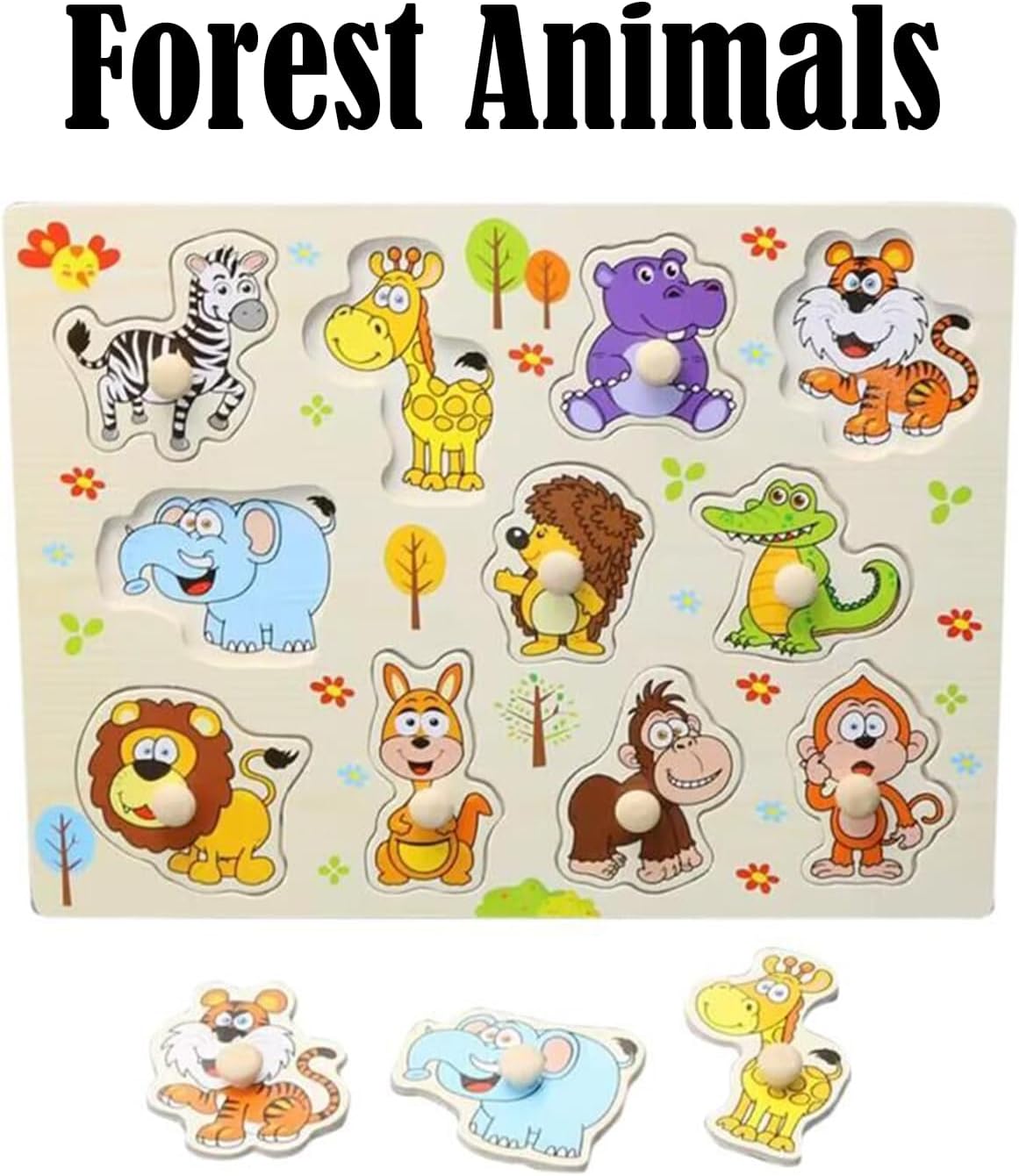 Puzzle incastru din lemn cu butoni si 11 animale salbatice din jungla
