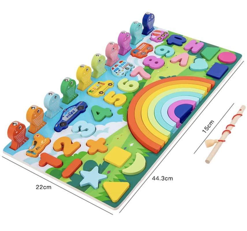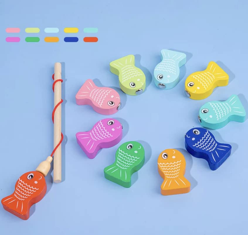 Include o undiță cu capăt magnetic și 10 peștișori colorați numerotați.