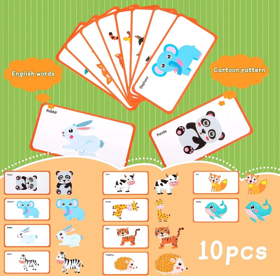Stimulează recunoașterea animalelor și vocabularul în limba engleză (fiecare card conține și denumirea animalului)