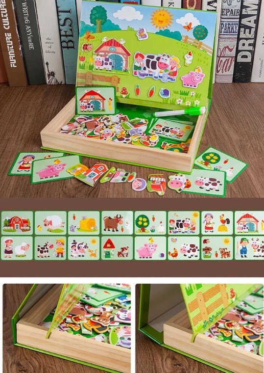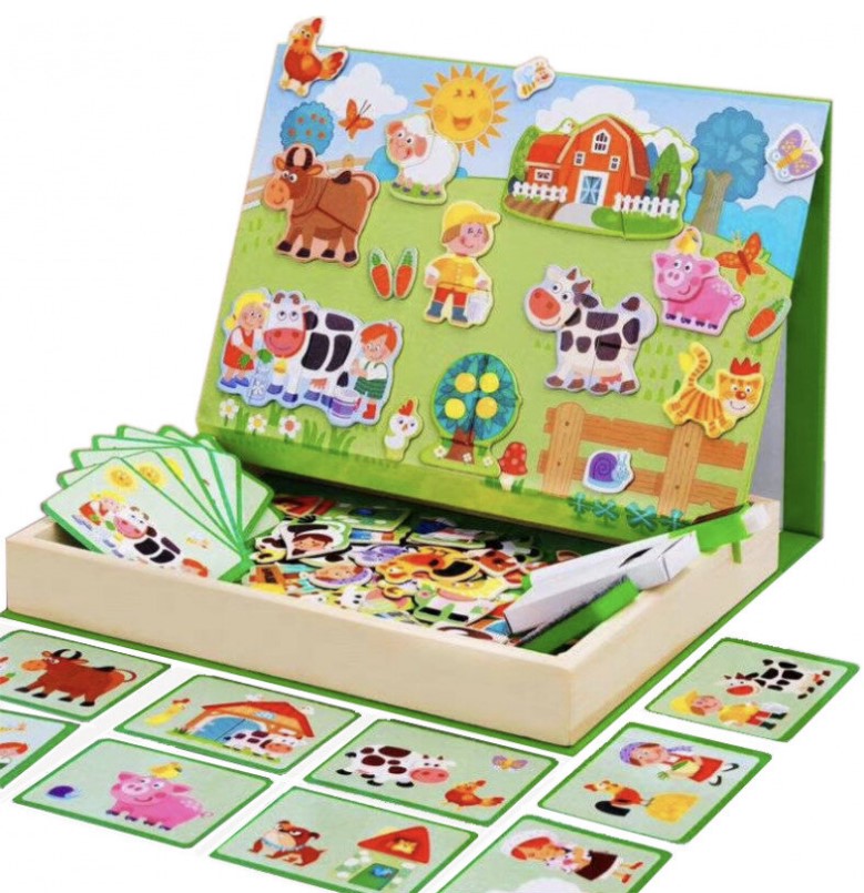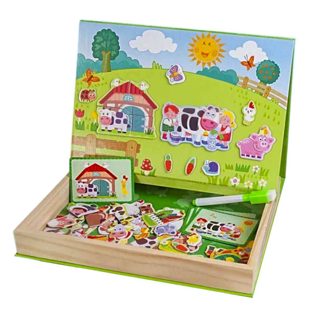 Acest puzzle magnetic educativ tip carte cu tematică „Animale de la fermă” este un joc creativ și interactiv, conceput pentru copiii de la 3 ani în sus. Jocul le permite celor mici să descopere viața la fermă și să învețe să recunoască animalele domestice, obiectele și personajele din mediul rural prin activități distractive de asociere și imaginație.