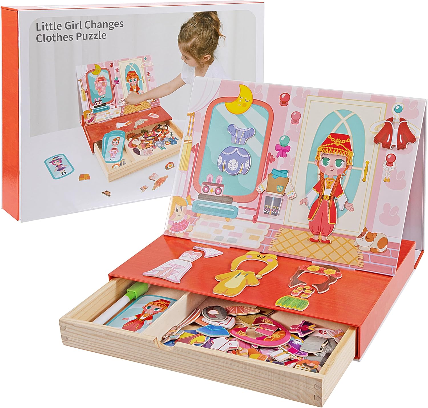 Puzzle-ul magnetic tip carte „Îmbracă fetița” este un joc educativ și creativ recomandat copiilor de peste 3 ani.