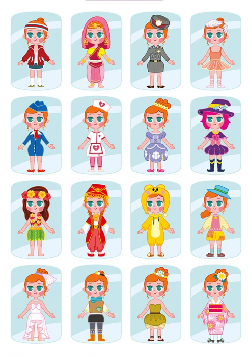 Copilul poate alege să reproducă ținutele de pe cardurile incluse sau să creeze propriile combinații de haine și accesorii, explorând liber diferite variante. Tabla magnetică se poate folosi și ca suport pentru desen, oferind posibilitatea de a completa povești vizuale cu markerul inclus. Jocul permite activități independente, dar este la fel de valoros și în sesiunile de joacă împreună cu părinții, stimulând interacțiunea și exprimarea liberă.