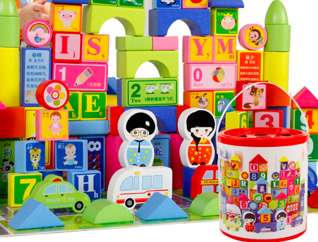 Acest set contine 100 de blocuri din lemn, colorate , ambalate într-un saculet pentru pastrare si o galetusa utila pentru depozitare, care are un capac ce poate fi folosit la sortatea diferitelor forme geometrice continute in set.
