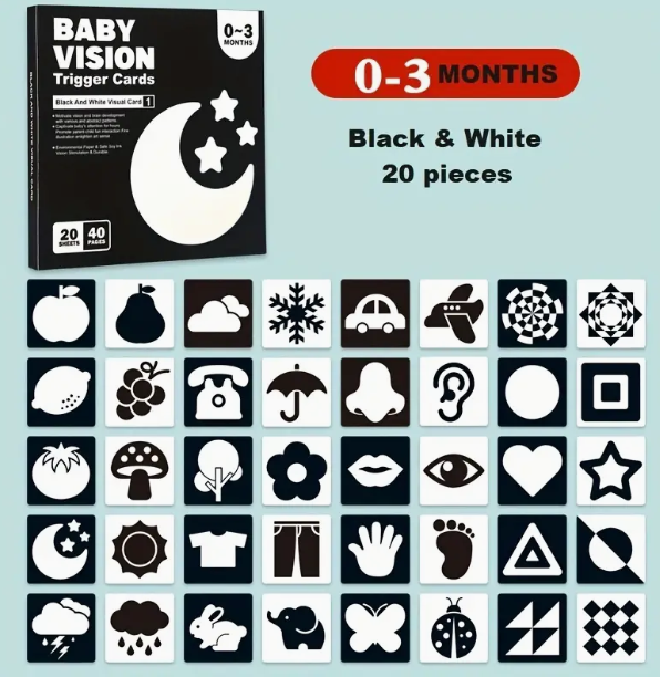 Aceste carduri sunt potrivite pentru bebelusii de la 0-3 luni, contine 20 carduri, folosite pentru antrenamentul de stimulare vizuala si dezvoltarea abilitatilor cognitive.