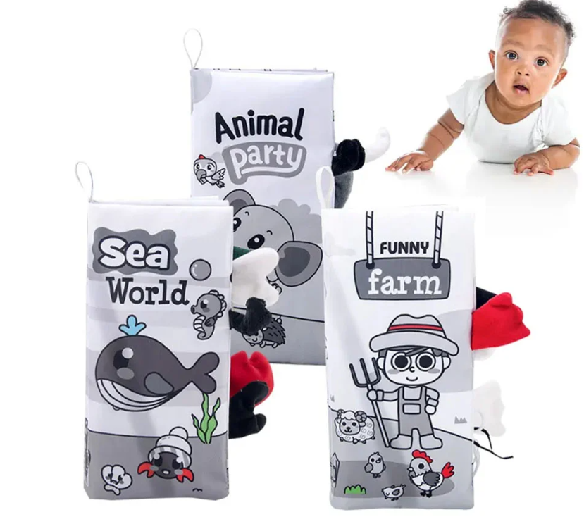 - Elemente Senzoriale: Fiecare carte include elemente tactile, cum ar fi pagini care fosnesc sau texturi diferite, menite să stimuleze simțul tactil al bebelușului. De asemenea, cărțile includ diferite forme de animale sau obiecte care pot fi apucate și manipulate de copil, dezvoltând astfel motricitatea fină.