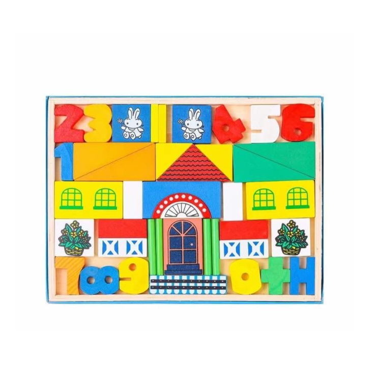 Set de constructie cu piese de lemn colorate contine 42 de piese de diferite culori, cu cifre si tavita de depozitare.