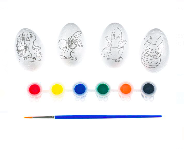 Set artizanat de Paste cu 4 oua de spuma, 1 pensula si 6 vopsele (rosu, albastru, galben, verde, portocaliu, negru). Pictează-ți propriile ouă de Paște în orice culoare dorești!