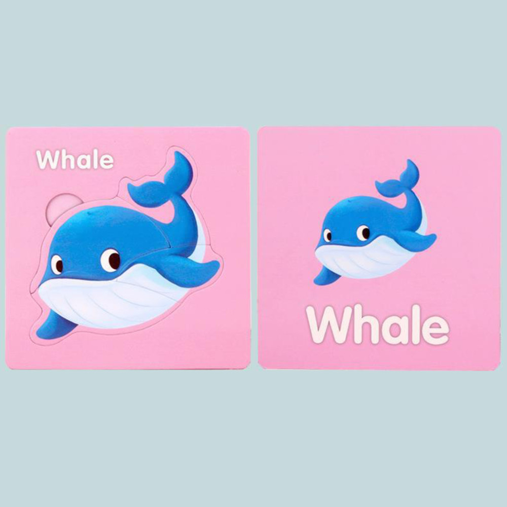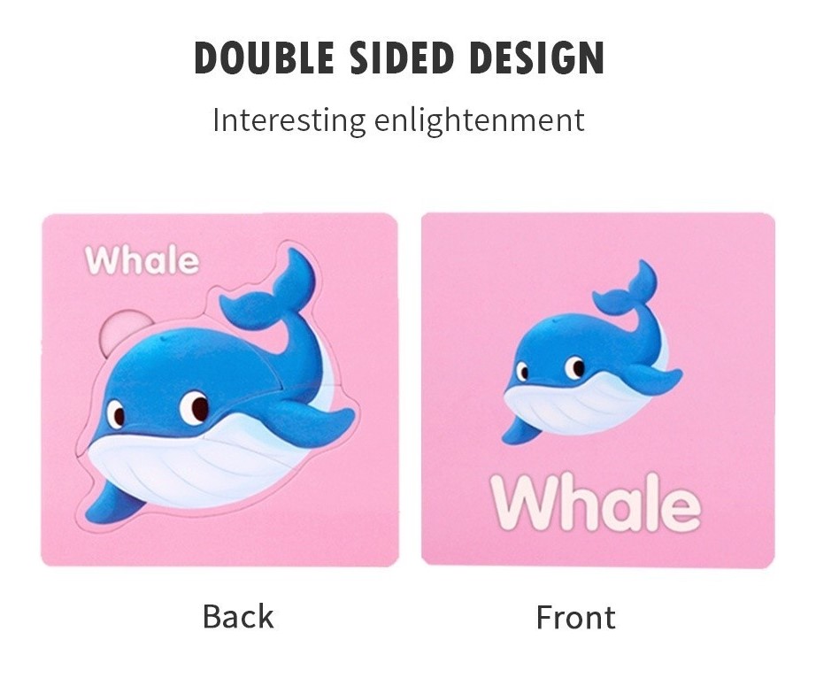 Design dublu: pe o parte insecta este completă cu denumirea în limba engleză, iar pe cealaltă parte copilul rezolvă puzzle-ul.