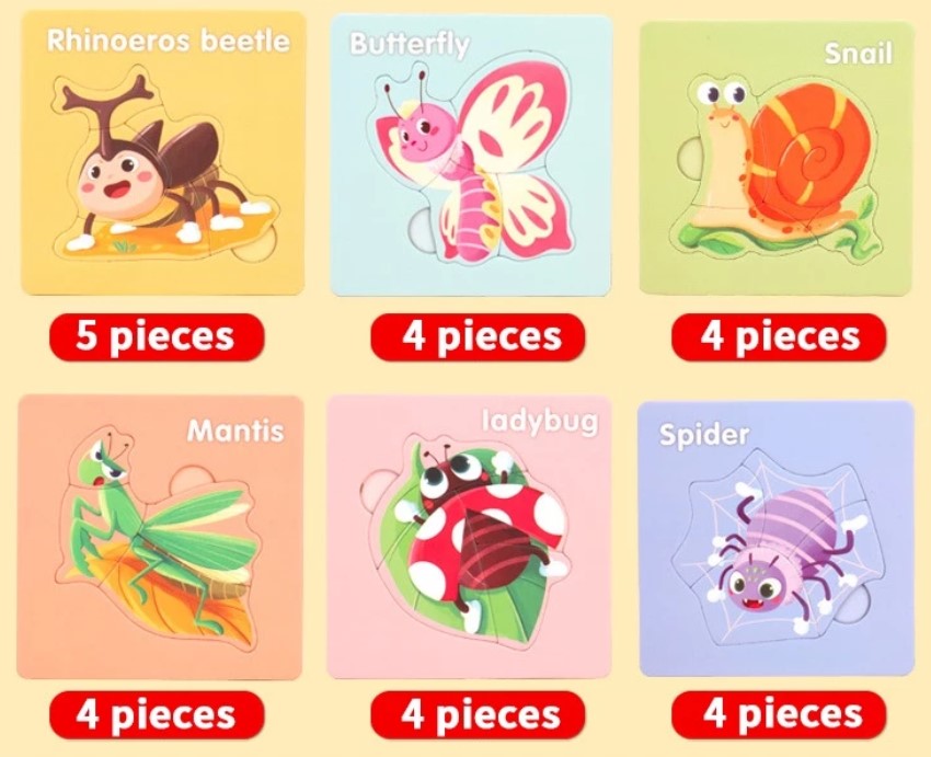 Setul conține 6 puzzle-uri individuale, fiecare reprezentând câte o insectă:
