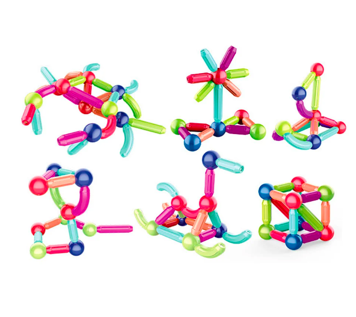 Cu bețele și bilele magnetice, se pot crea structuri 3D: turnuri, poduri sau forme abstracte.