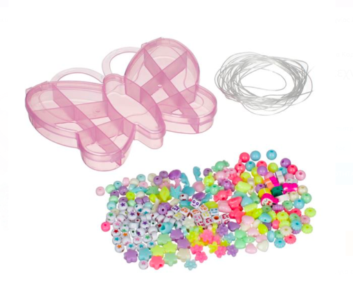 Set de diverse margele artizanale pentru coliere si snururi elastice, in interiorul unei cutii de inghetata.