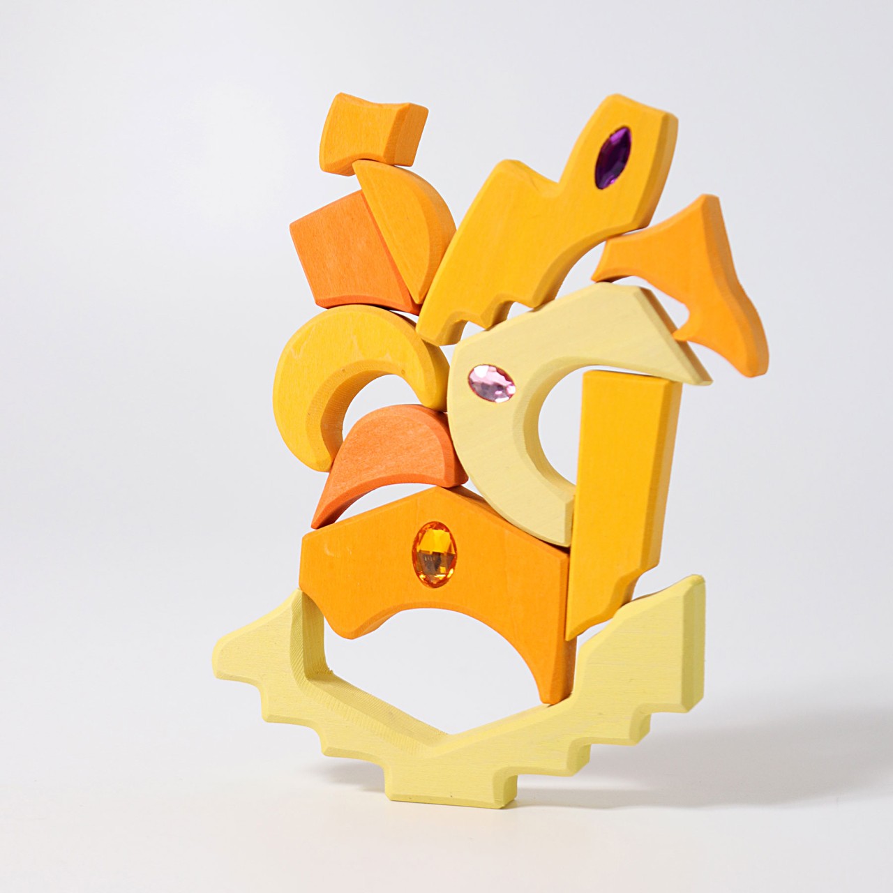 Conține: piese din lemn colorate, în forme organice și arhitecturale, cu detalii ornamentale (cristale acrilice colorate)