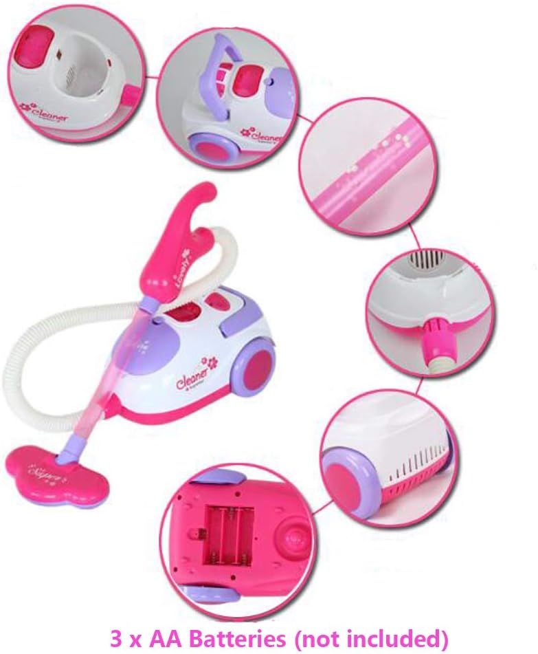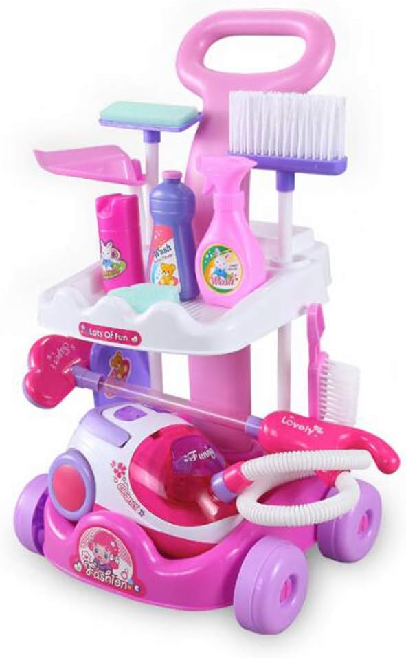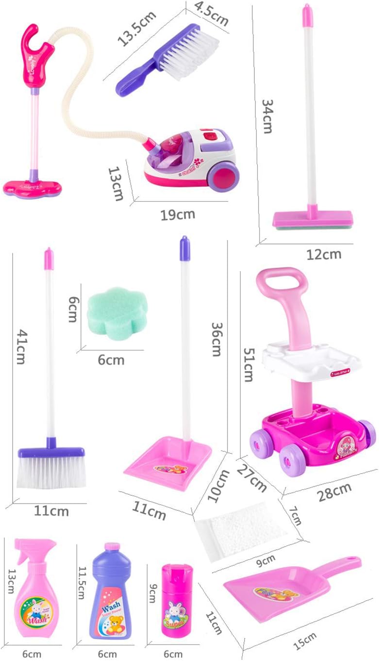 Setul include un cărucior de curățenie pe roți, dotat cu 11 accesorii esențiale: aspirator cu funcții sonore și luminoase, mătură, făraș, mop, perie, burete, sticluțe de „detergent” și alte ustensile pentru curățenie. Aspiratorul funcționează pe bază de baterii (3xAA – neincluse), având efecte de lumină și sunet care oferă o experiență realistă și captivantă.