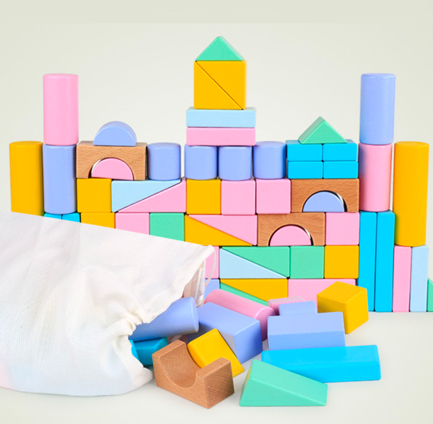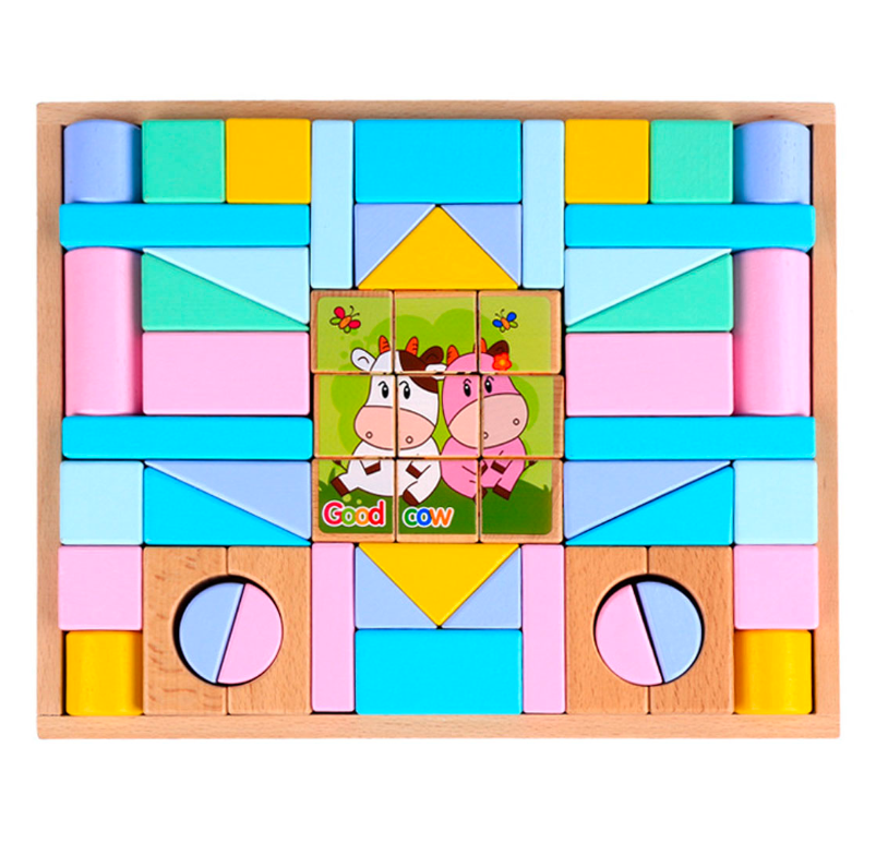 - Set complet de construcție: Include 57 de cuburi din lemn de diferite dimensiuni și forme (triunghiuri, pătrate, cilindri, etc.), care permit copiilor să construiască diverse structuri, dezvoltându-le imaginația și abilitățile de rezolvare a problemelor.