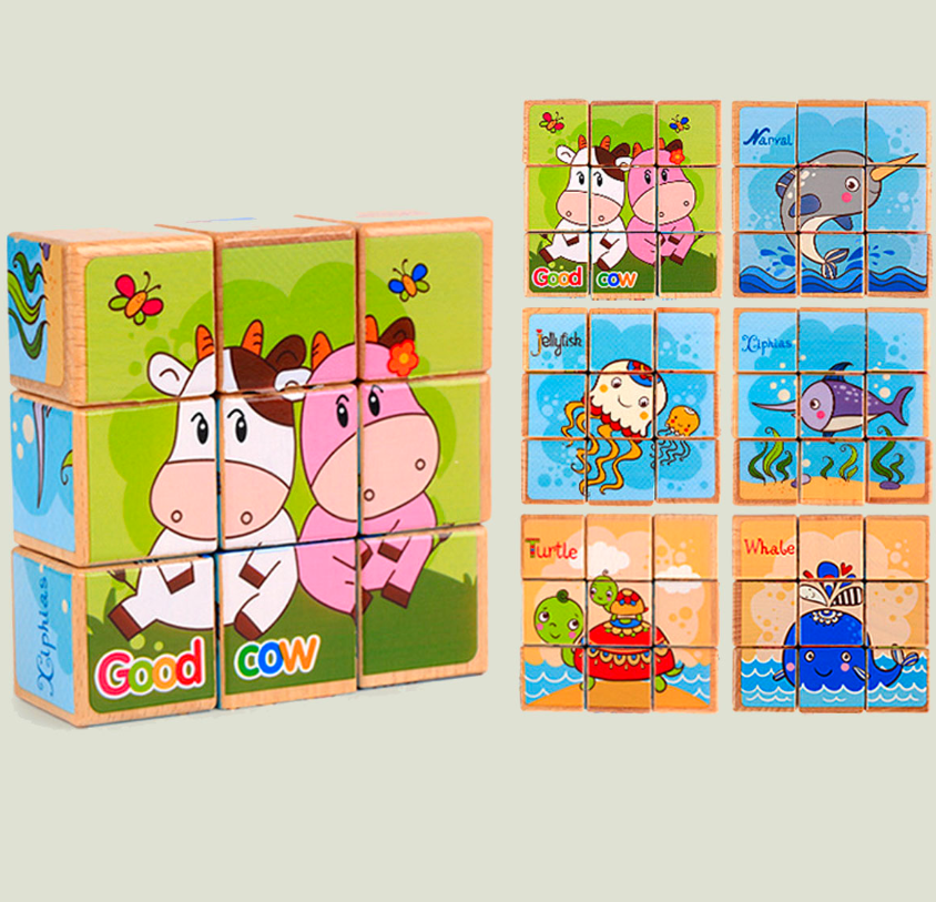 - Puzzle cubic cu tematică animale: În plus față de cuburile clasice, setul include și un puzzle cubic special, cu tematică animale, care stimulează gândirea logică și coordonarea mână-ochi. Copiii pot asambla imagini cu animale precum vaca, balena sau broasca țestoasă.