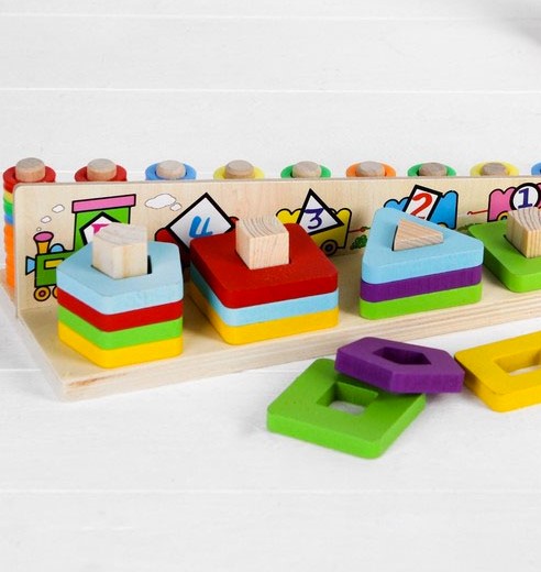 Sortator de forme geometrice, cu 5 coloane ce permit stivuirea formelor colorate pe baza formei și a dimensiunii (pătrat, triunghi, cerc, hexagon, dreptunghi).
