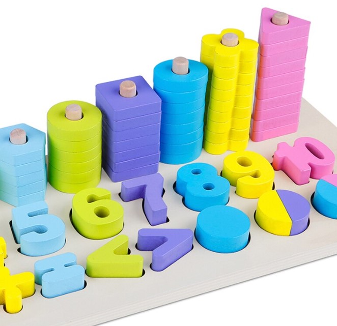 Coloane logaritmice cu forme geometrice, unde copilul stivuiește pe fiecare coloană numărul corespunzător de forme în funcție de cifră