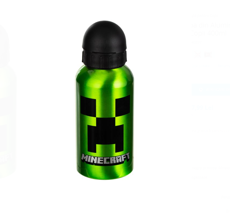 Sticla de apa, din aluminiu, pentru baieti de culoare verde cu capac negru si model Minecraft.