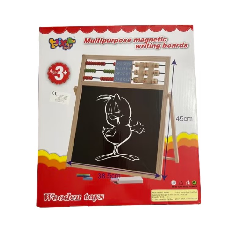 Tablă educativă din lemn cu dublă față, ideală pentru învățarea interactivă a literelor, cifrelor și noțiunilor matematice. Include: