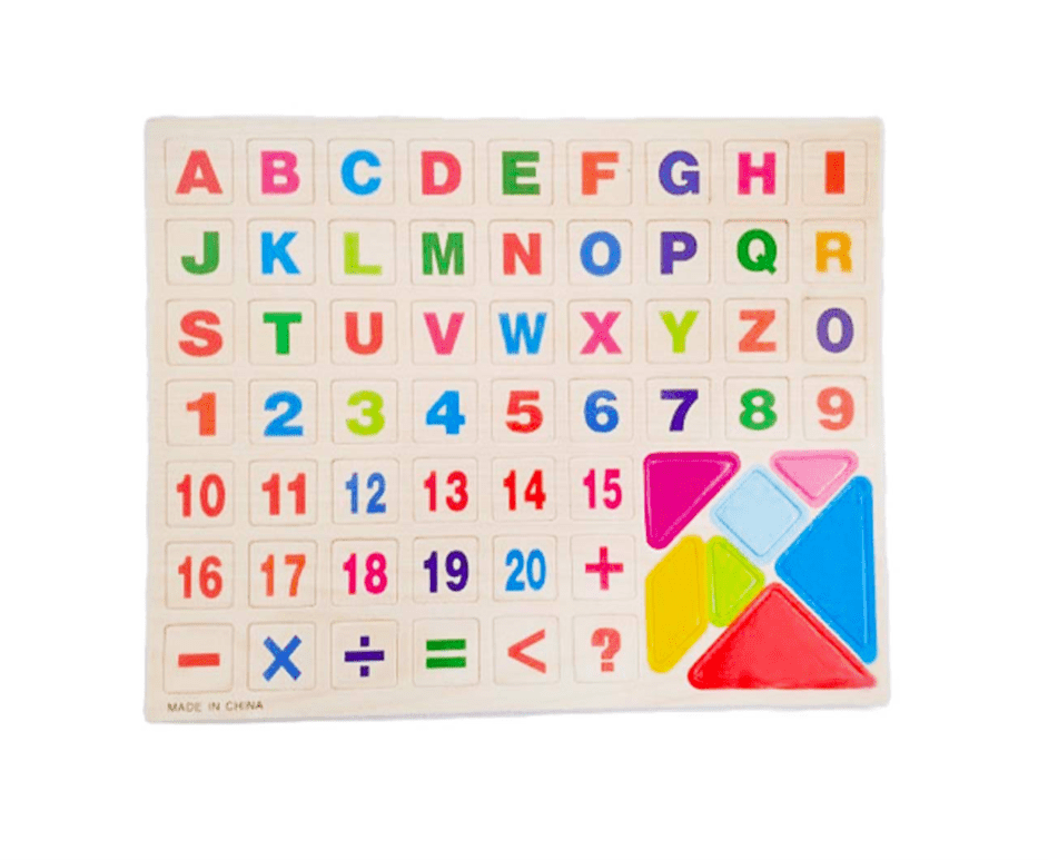 - un set complet de litere, ale alfabetului englezesc, un set de cifre si numere de la 0-20, semne aritmetice pentru operatii de baza si joc Tangram cu 7 piese, toate magnetice.