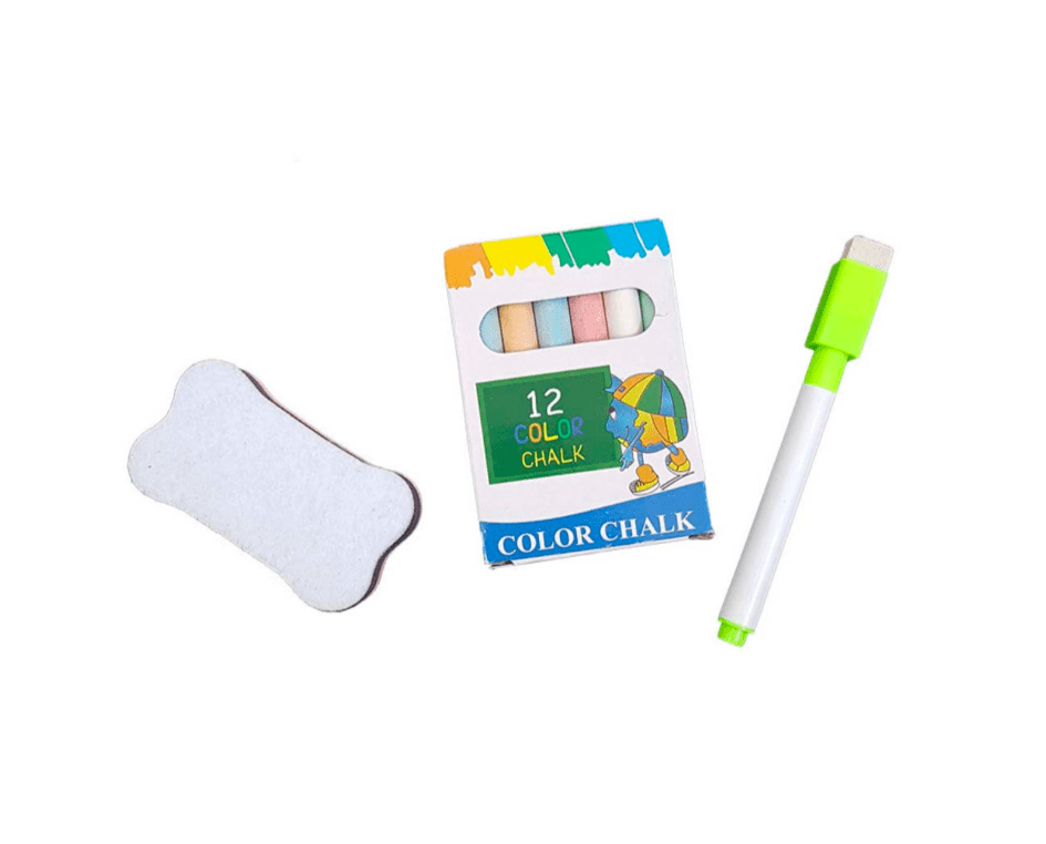 In pachet este inclusa o cutie cu creta, un marker si un burete de sters.
