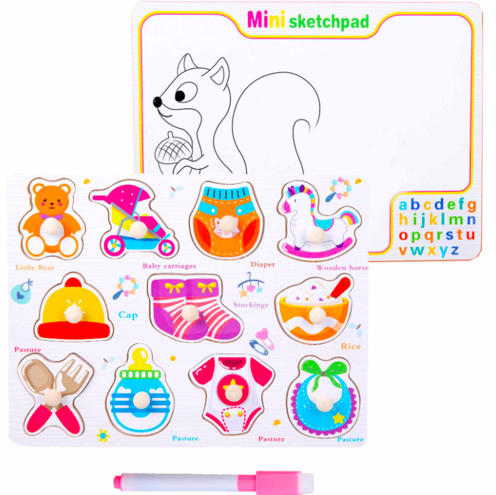 Ajută-ți copilul să descopere lumea obiectelor familiare printr-o jucărie educativă și distractivă! Această tabliță 2-în-1 combină puzzle-ul incastru cu o tablă de desen reutilizabilă, oferind numeroase oportunități de învățare și joacă.