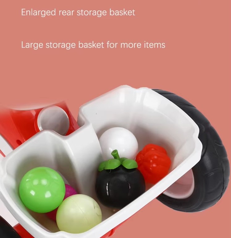 Coș de depozitare în spate: spațiu util pentru jucării, gustări sau obiectele preferate ale copilului.