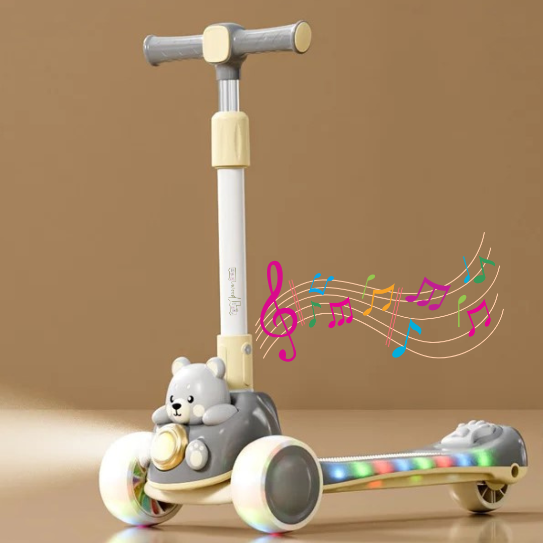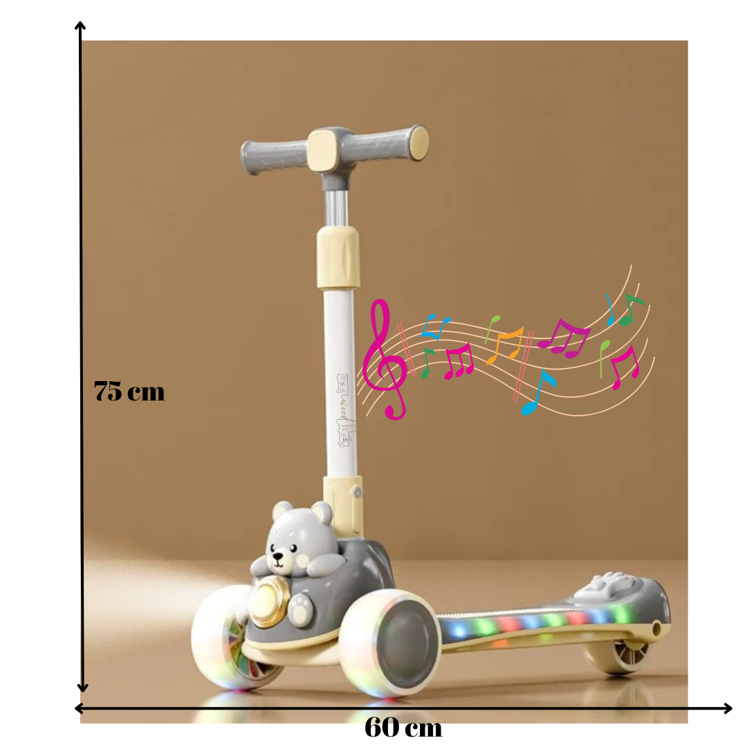 Trotinetă cu 3 roți pentru copii – model Ursuleț Gri, cu far, lumini și sunete, pliabilă, 3 ani+