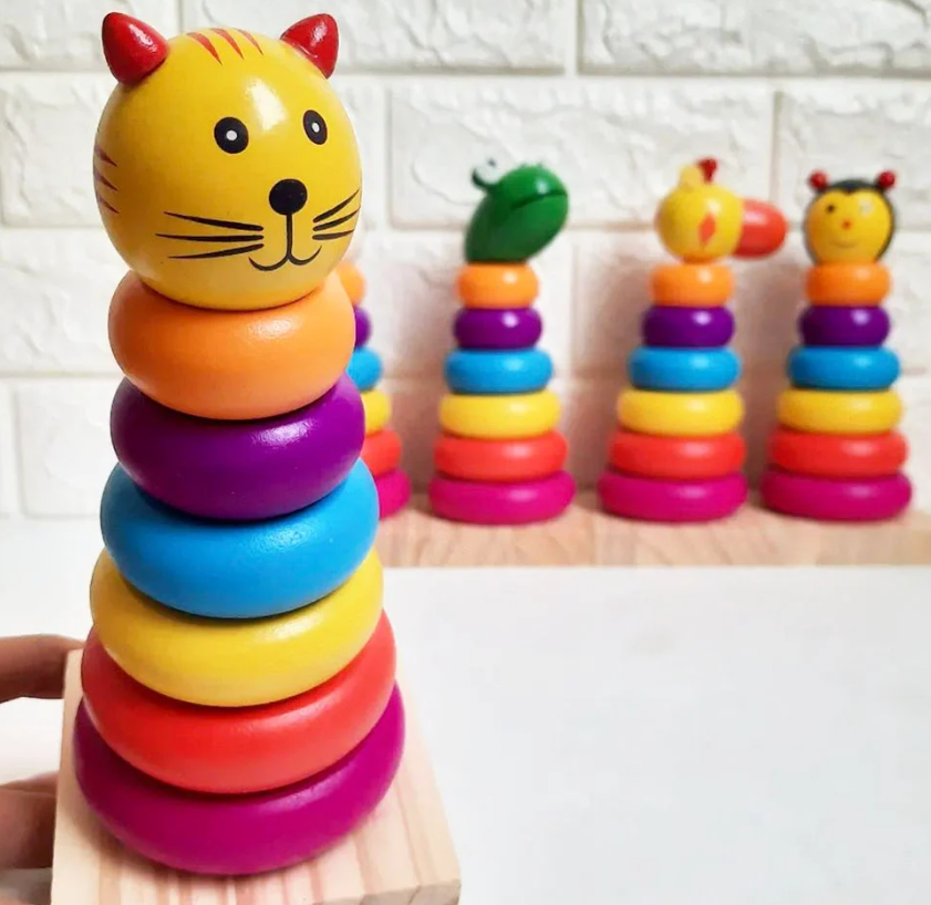 Jucaria educativa tip turn Montessori din lemn este alcatuita dintr-o baza din lemn cu suport vertical, pe care se pun formele din lemn, unul deasupra celuilalt in ordinea marimii, pentru a crea o piramida, sau dupa cum doreste copilul.