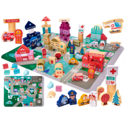 - Setul include cuburi de diverse forme geometrice si elemente precum vehicule, copaci, fatade de cladiri, care il vor ajuta pe copilul tau sa creeze un oras minunat, precum si un covoras format din piese de puzzle, din carton, care contin strazi, treceri de pietoni, numai bune pentru a-i invata pe cei mici despre regulile de circulatie;